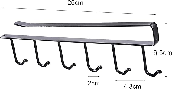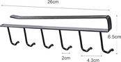 【商品仕様】サイズ(約):26cm×6.5cm×1.5cm。重量:約0.14KG。カラー:ブラック。材質:鉄(吹き付け塗装) 間隔:約4.3cm、フック6個付き。