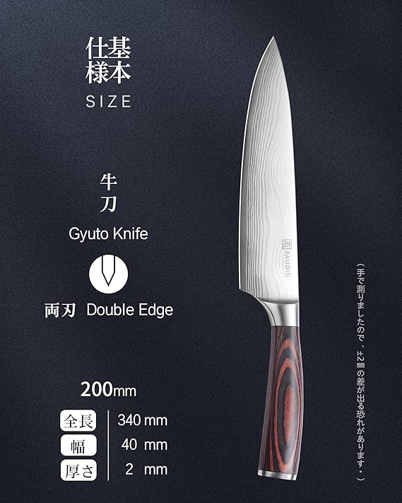 鋭利な切れ味:この牛刀包丁は優れた切れ味を持っています。専門の職人によって精密に研ぎ澄まされた刃は、食材を繊細かつ正確に切断します。料理の仕上がりにクオリティとプロの技を加えることができます。