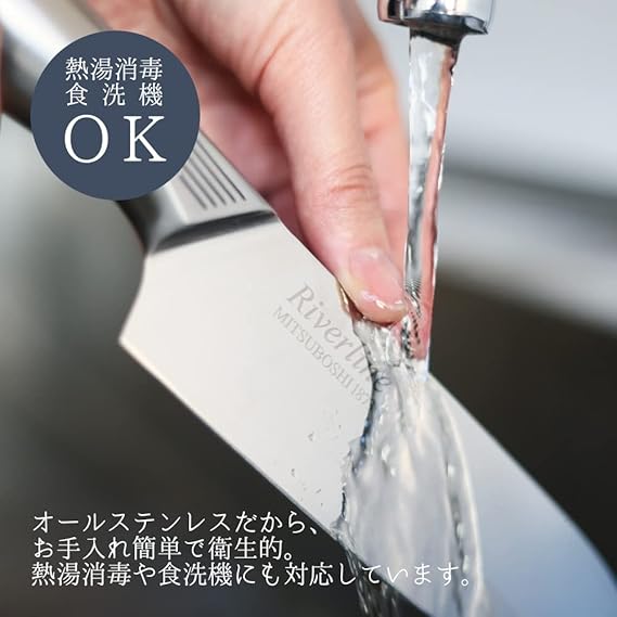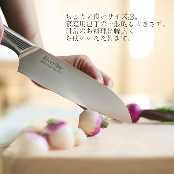 【Riverline(リバーライン)】明治6年創業、約150年の歴史をもつ老舗刃物メーカーが作り上げた、オールステンレスの包丁。その名も「Riverline」。5本の線と流線を描くハンドルは、関市内を清らかに流れる長良川をイメージしたものです。自然・歴史・美しさを表現し、永くご愛用いただけるデザインを目指しました。(生産国:日本)※三星刃物が企画・製造・販売をおこなっています。