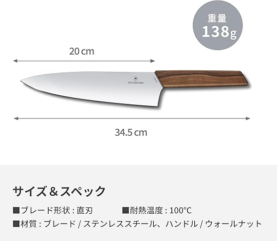 ハンドル素材に高品質な欧州産クルミ材<ウォールナット>を使用し、熟練の職人が手作業で仕上げたエレガントなシリーズ。ビクトリノックス独自の鋼材を使用したブレードと特徴的な木目は、あなたの料理に彩りを加えます。しっかりと刃厚があるので、塊肉や根菜のカットに活躍します。