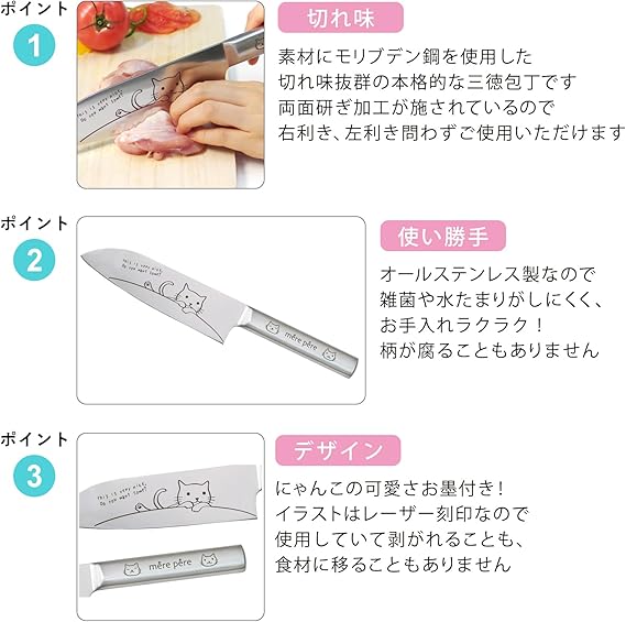 ◆ネコのイラストが入ったかわいいデザインの包丁です。かわいいだけじゃなく、素材にモリブデン鋼を使用していて非常に鋭い切れ味。 毎日活躍する万能サイズの三徳包丁です。