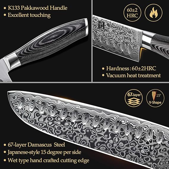 17.8cm 三徳包丁67層ダマスカス鋼Santokuナイフダマスカス鋼キッチンナイフ-多機能シェフナイフ調理ナイフ-ダマスカス野菜ナイフ-人体工学的なPakka木ハンドル-ギフトボックス付き a a