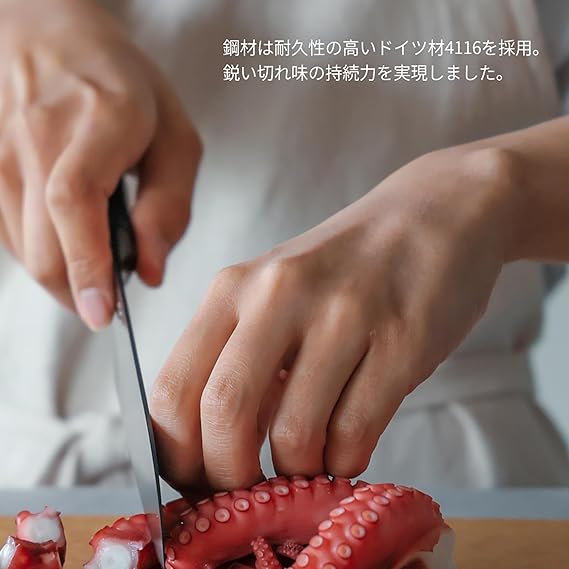 【BLACK INFINITY(ブラックインフィニティ)】私たちが目指したのは、スタイリッシュで毎日使いたくなる“オシャレな包丁”。オールマットブラック仕上げの洗練されたモダンなデザインは、キッチンに立つ時間を楽しいひと時にしてくれます。スタイリッシュなマットブラックは落ち着いた上品な雰囲気を演出。包丁全体の形状もシンプルな美しさを追求しました。(生産国:中国)※三星刃物が企画・製造・販売をおこなっています。