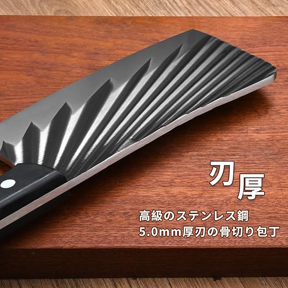 2✿(重型骨切り包丁)5.0mmの背厚と重量感を持つ骨切り包丁はラム、ビーフマロー、豚骨などの大骨と冷凍品を楽に叩き切ります。広い刃幅と重量感は大根、キャベツの千切り、大蒜の潰し、肉のみじん切りを簡単に実現します。板厚い刃背を利用し、豚肉と牛肉を叩き、弾力性出り、家庭でも美味しいステー