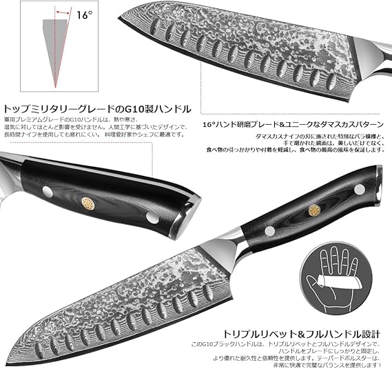 三徳包丁 ダマスカス包丁 刃渡り176mm. キッチン用万能, 牛刀 シェフナイフ. 67層の高炭素ステンレス鋼, フルタング構造&ブラック G10ハンドル. 切れ味長持ち 野菜切り 肉 果物 多機能 家庭用 料理用 業務用. ギフトボックス付き a a