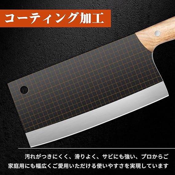 【高級な素材】ドイツ高炭素ステンレス鋼で鍛造加工中華包丁で、全長約297mm、刃長約180mm、刃幅約89mm、背厚さ約2.5mm、重量約369gです。使用されているステンレススチールは、焼入れ硬化性が高く、適切な熱処理で、耐摩耗性は高くなり、包丁の切れ味長持ち、耐磨耗が強く、サビに強くなるメリットがあります。