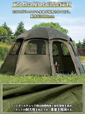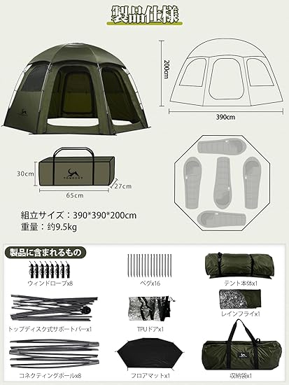 【広々とした大空間】テントの高さが2mあるので、テントの中で圧迫感を感じず、大柄な男子でも完全に直立できます。直径3.9mで室内空間には十分な広さがあり、また真ん中に邪魔なポールがないので、コットなどの家具を複数置くことができ、3~4人で使用できます。底部には風やホコリから守るインナースカートを装備し、フロアマットも付属しており、設置後はテントの中で裸足になってのんびりキャンプを楽しむことができます。薪ストーブを使用する場合は、テント上部の窓から煙突を延長することも可能です。 (雨天時使用不可)