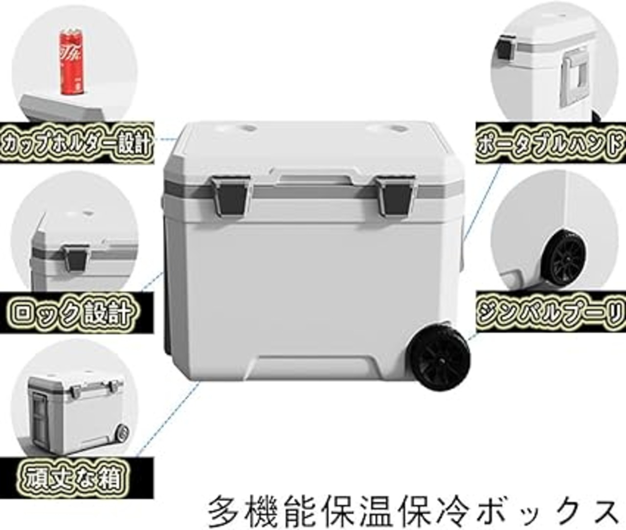 両側には移動時に便利なハンドルが付いています。350ミリリットル缶57本は、大人数キャンプにぴったり!大人でも座れる丈夫な体です。少し息抜きをしているとき、釣りをしているときなどに座ることができます。底部のユニバーサルホイールは、あらゆる場面で移動できるように設計されています。