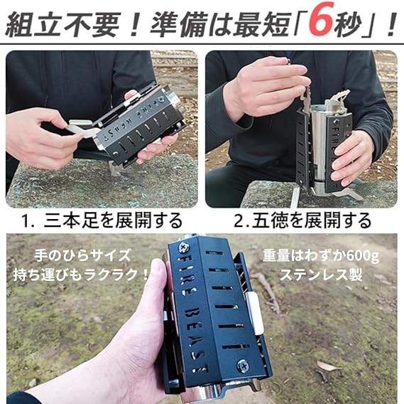 【コンパクト設計】脚や五徳を本体にすっきり収納できる設計で、持ち運びも簡単。組み立て不要で、キャンプやアウトドアに最適。準備が楽チンで、すぐに使える便利なギアです。
