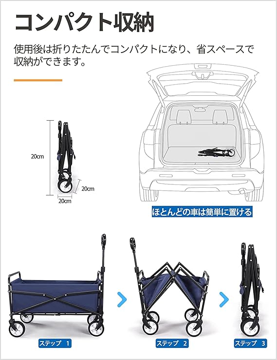 大容量デザイン:大容量120 Lを備えており、野外用品や食品、その他の必需品を持ち運ぶのに便利です。使用時のサイズは奥行き75 cm、幅46 cm、高さ48 cmで、収納時には奥行き47 cm、幅14 cm、高さ66 cmにコンパクトに折りたたむことができます。キャンプやファミリーピクニックなど、屋外活動に必要なものをしっかりと運ぶことができる実用的なアイテムです