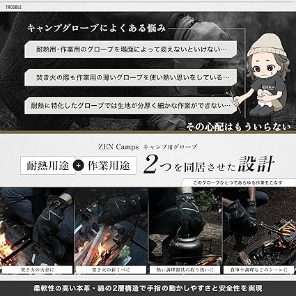 【材料】手袋本体:牛革 裏地:100%綿 ZEN Camps 耐熱性と作業製に優れたキャンプ専用グロ