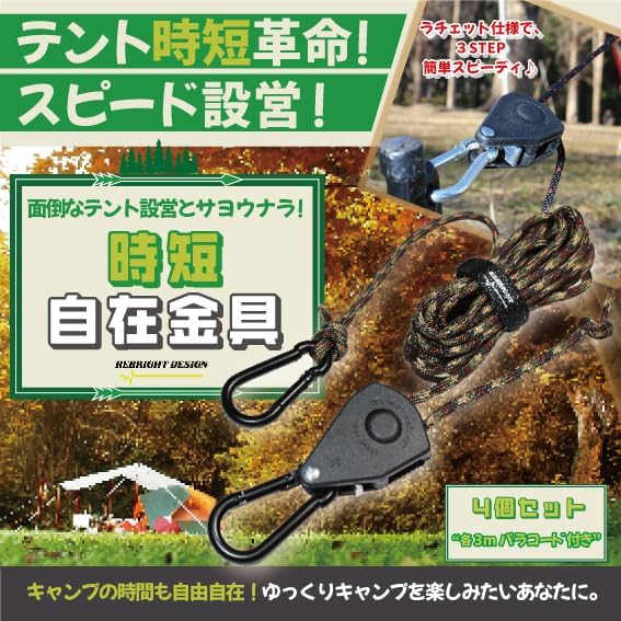 【キャンプ設営の超時短に!】面倒なロープワークが不要!簡単にテントやタープ設営ができます。早くキャンプしたいのに、なかなか設営が終わらない〜!とお悩みの方に是非!