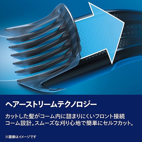 ヘアーストリームテクノロジー搭載 カットした髪がコーム内に詰まりにくいフロント接続コーム設計。スムーズな刈り心地で簡単にセルフカット。