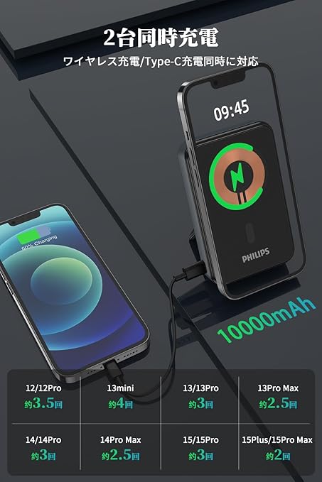 Philips マグネット式 10000mAh MagSafe ワイヤレスモバイルバッテリー 小型 携帯充電器 大容量 2台同時充電 パススルー機能/入出力USB-Cポート/スタンド付き PSE認証済 機内持込可能 DLP2716QB a