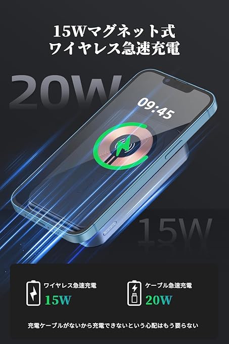 【最大20W急速充電&強い吸着力】MagSafe/Quick Charge充電規格に対応し、ワイヤレス出力(15W)とType-C 出力ポート(QC 20W)の2つの出力方式を備えています。3A出力は、iOSのデバイスだけでなく、Androidのデバイスにも、より速くデバイスを充電することができます。強力な磁気コイルを内蔵し、充電ケーブルを抜く必要がなく、従来のモバイル充電器より便利で、電源の位置を調整する必要がありません。ワイヤレス充電エリアにスマホを置き、電源ボタンを押して充電を開始されます