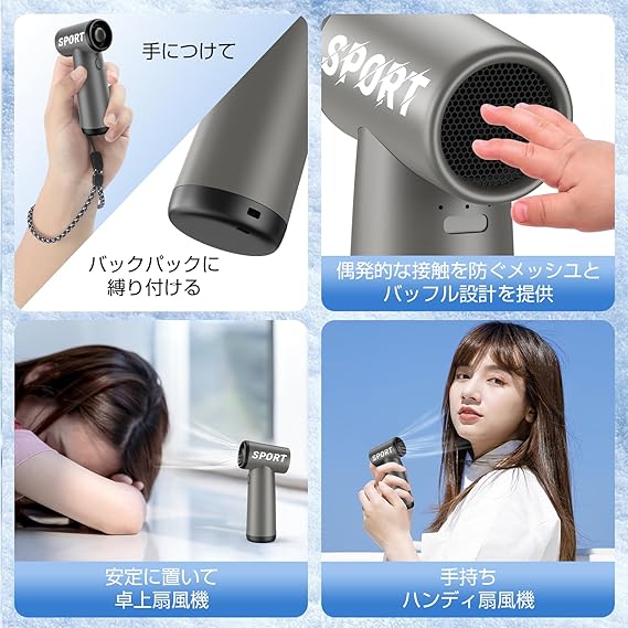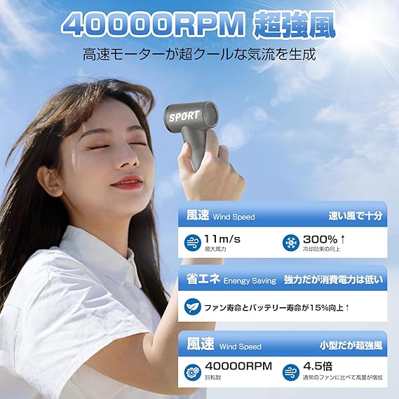 【爆風!熱中症対策に最適!】真夏の蒸し暑さを快適に過ごすためには、携帯扇風機は欠かせないアイテムですな!その携帯扇風機の回転数は40000RPMで、電源ボタンを長押しすれば、起動できます!炎天下で扇風機のプレートを火照った肌に当てて、心地よく氷のような冷たさが感じられます。熱中症対策に最適な携帯扇風機です。