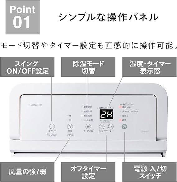 ツインバード 衣類乾燥 除湿機 8畳〜 コンプレッサー式 梅雨対策 4L 大容量 スピード乾燥 タイマー付 キャスター付 ホワイト JS-E955W a