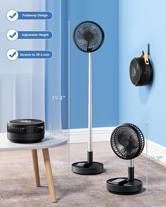 10400mAhの大型バッテリー: このバッテリー駆動ファンは10400mAhの大容量で動作し、8時間フル充電され、コンセントなしで10~30Hの冷却緩和を保証します。4速、動作時間は異なる速度と振動によって異なります。 注意:最初に使用する前に充電してください。