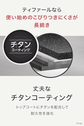 素材・材質:本体/アルミニウム合金、加工/チタン・コーティング(内面)・ふっ素樹脂塗膜加工 (外面)、底/アルミニウム合金・ステンレス鋼 (クロム16%)、ふた・ふたつまみ/アルミニウム合金、生産国:中国