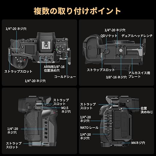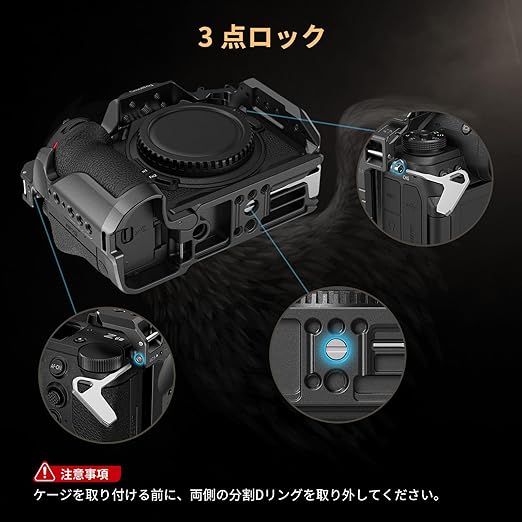 【ねじれ防止ロック設計】 3 点ロック システムにより、ベースに 1/4"-20 ネジ 1 本、側面に M2.5 ネジ 2 本でカメラを固定することで、安定性を確保し、ねじれを防止します。 【注意事項】 ケージを取り付けるには、カメラの分割