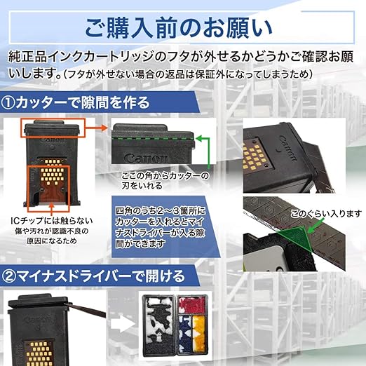 本商品はCanon製の純正品インクカートリッジのフタを外し、その中身を詰め替える方式のインクになります。純正品カートリッジは付属しておりません。また、残量検知機能はリセットされずゼロのままになりますので、お客様ご自身で残量検知機能をオフにし、それ以後は印字具合を見てインクの減り具合を判断していただく使い方になります。 なお、ご注文される前に純正品インクカートリッジのフタを外すことができるかどうか必ずご確認くださいますようお願いいたします。フタが外れない場合の返品は保証対象にはなりません。