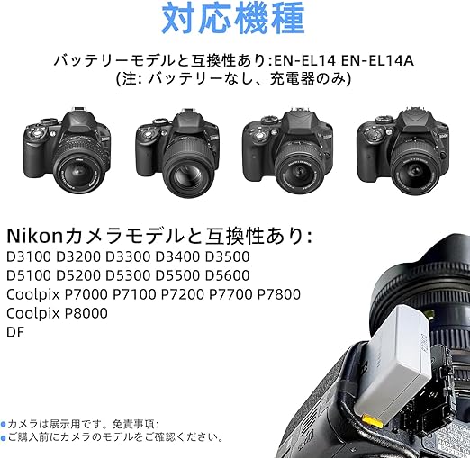 【対応モデル】バッテリーモデル EN-EL14 EN-EL14A (注意: バッテリーなし、充電器のみ)。互換性Nikon D3100 D3200 D3300 D3400 D3500 D5100 D5200 D5300 D5500 D5600 P7000 P7100 P7700 P7800 とがあります。注意: 購入前に互換性を確認してください。