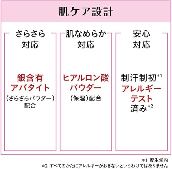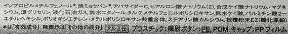 全成分:イソプロピルメチルフェノール*,焼ミョウバン*,アパサイダーC,ヒアルロン酸ナトリウム(2),合成ケイ酸ナトリウム・マグネシウム,濃グリセリン,液化石油ガス,無水エタノール,タルク,メチルフェニルポリシロキサン,無水ケイ酸,パルミチン酸4-エチルヘキシル,ポリオキシエチレン・メチルポリシロキサン共重合体,ステアリン酸カルシウ