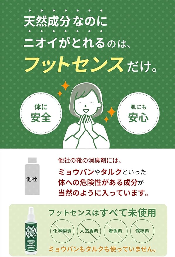 【 天然成分なのにニオイがとれる 】 体に安全。肌にも安心。フットセンス(Foot Sense)は、化学物質、香料、着色料、保存料をすべて未使用。ミョウバンもタルクも使っていません。