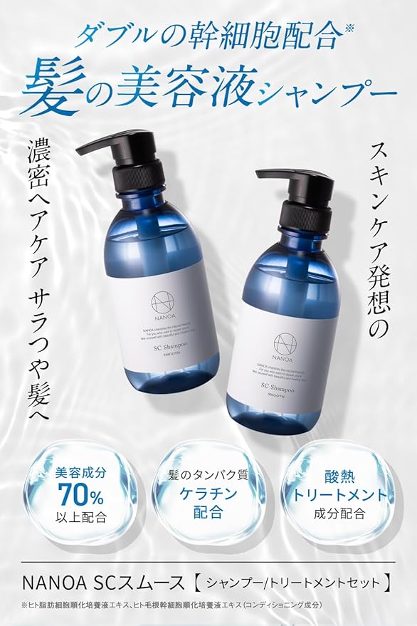【スキンケア発想から生まれた髪の美容液シャンプー】NANOAシャンプートリートメントセットは、髪のパサつきを抑え、髪のまとまり、指通りに着目したプレミアムシャンプー・トリートメントです。スムースタイプで、まとまり感、サラサラの髪を目指す方に使いやすいバランス良い使用感です。