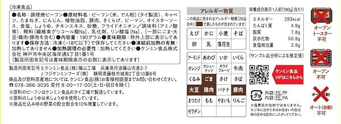 ビーフン(米、でん紛)(タイ製造)、キャベツ、たまねぎ、にんじん、植物油脂、豚肉、きくらげ、ピーマン、オイスターソース、食塩、しょうゆ、チキンエキス、砂糖、フライドオニオン/調味料(アミノ酸等)、糊料(繊維素グリコール酸Na)、乳化剤、リン酸塩(Na)、(一部にごま・大豆・鶏肉・豚肉を含む)