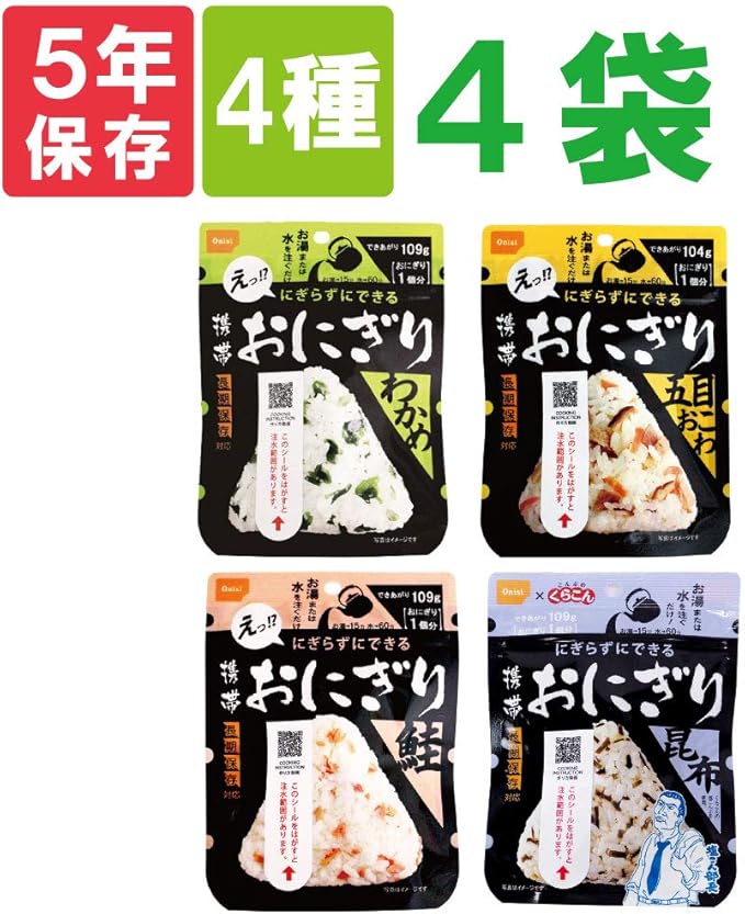 尾西の携帯おにぎり「4種類 4袋セット」 わかめ・鮭・五目おこわ・昆布 a