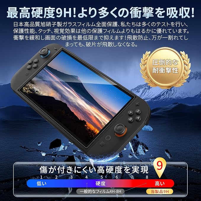 【硬度9H・飛散防止・傷防止】9H硬度、鍵などと一緒にバッグに入れても傷がつきません。日々の生活の中で発生するスリ傷から液晶画面を保護します。画面をきれいに守り、ゲームをより美しく体験できます。外部からの衝撃をフィルムが吸収し、画面へのダメージを最低限まで抑えました。万が一落としてガラスフィ