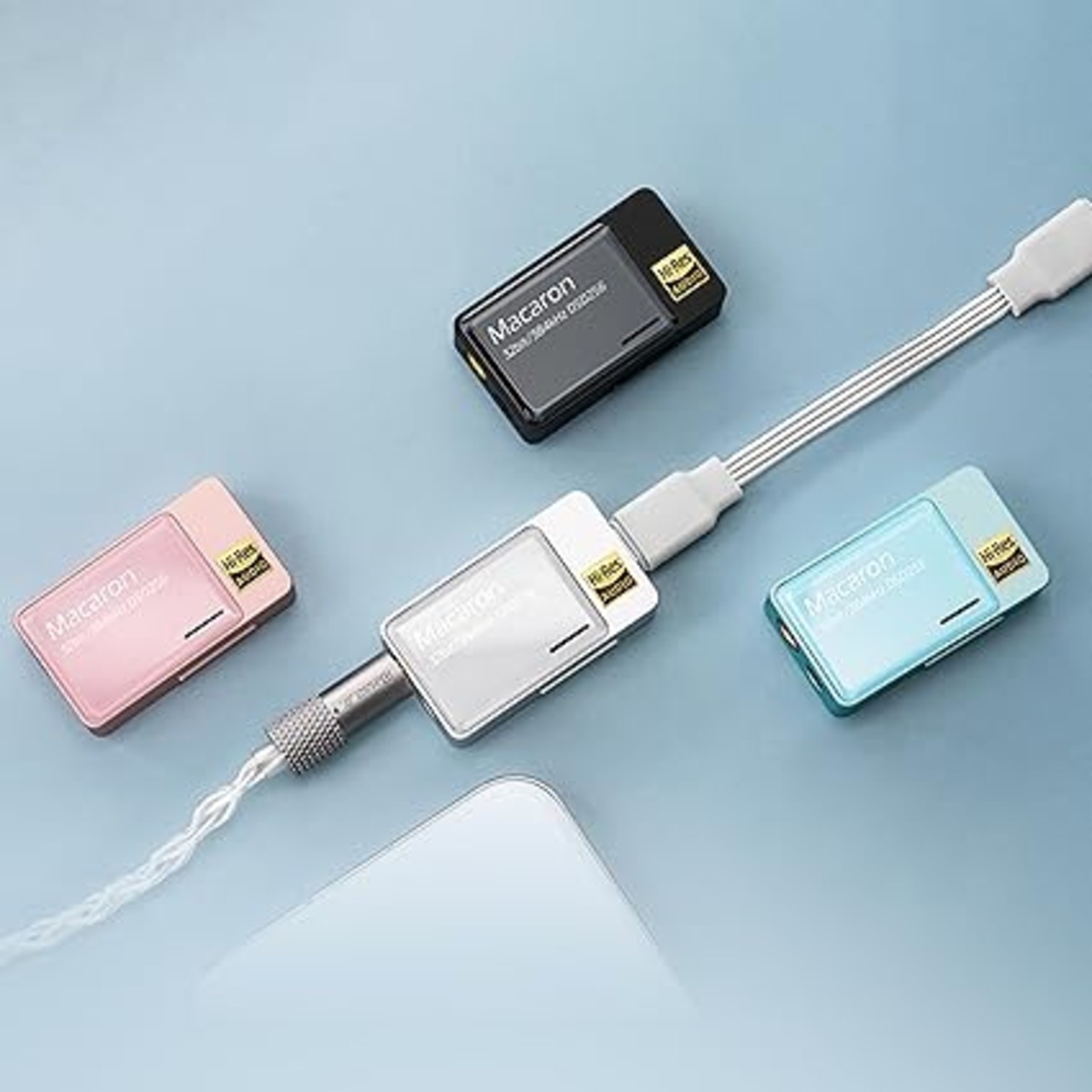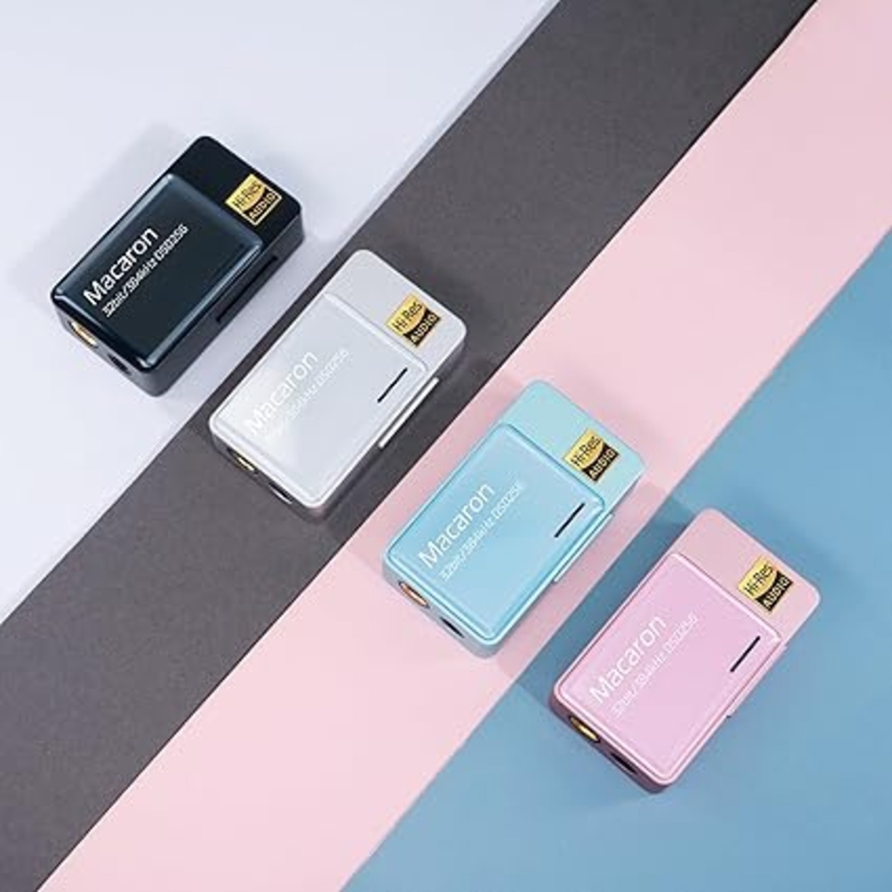 【愛嬌のあるスウィートデザイン】筐体には、丸みを帯びたアルミニウム合金 製CNCボディを採用し、両面強化ガラスパネ ルを採用した、わずか16gとコンパクトで軽量 なデザインを採用しています。 カラーバリエーションには、ブラック・シル バーの標準色に加え、ピンク・ブルーのス ウィートパステルカラーを用意し、オーディオ デバイスの雰囲気を感じさせない愛嬌のあ るデザインを採用しています。