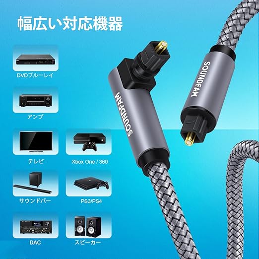 【幅広い互換性】-SOUNDFAMトスリンクケーブルは、サウンドバー、Blu-rayプレーヤー、DATレコーダー、CD/DVDプレーヤー、PS4/Xboxゲーム機などのトスリンク(S/PDIF、オプティカル)ポートを持つ標準およびHD機器、その他デジタル光インターフェース(S/PDIF)を持つオーディオ機器を、テレビ、レシーバー/プリアンプ、オーディオプロセッサー、またはデジタル-アナログコンバーターに接続できます。
