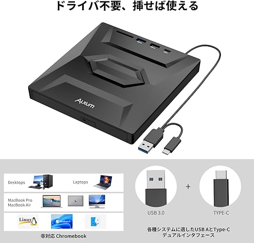 Alxum 超高速 CD/DVD ドライブ 外付け-ノートPC/デスクトップPC専用,5-IN-1 USB Type-C/USB 3.0 Aポータブル DVD 8倍速 CD 24倍速 レコーダー、SDスロット搭載、PC CDドライブ 外付け Window/Mac OS/Linux/Vista対応 黒 a