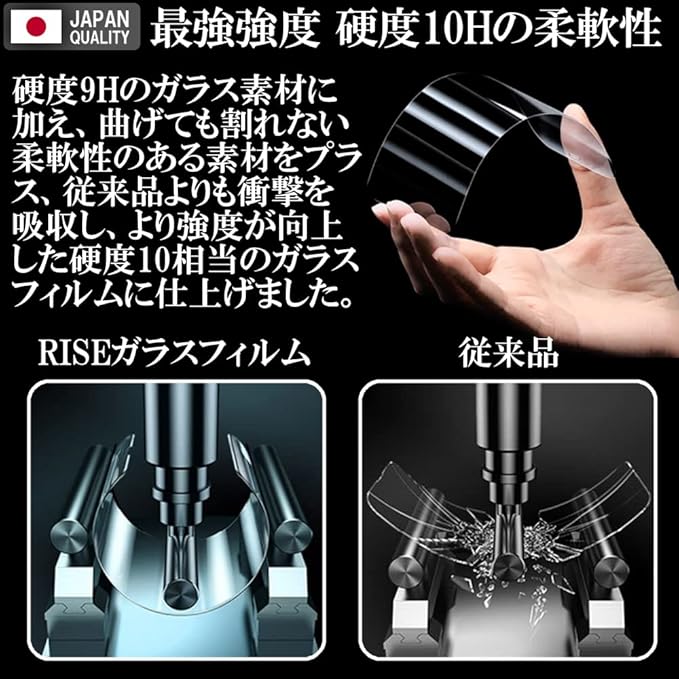 ガラス表面に400度の高温処理を6時間かけた強力コーティングを実現。フィルムが破損しても飛散防止加工で液晶画面を徹底保護。第3世代製法の最新技術のW硬化製法(2次強化)ガラスで対擦傷性を強化。