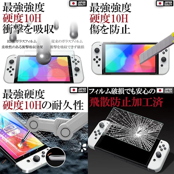 【対応機種及び仕様】Switch 有機EL モデル/Switch OLED 専用 クリアガラスフィルム。安心の日本製素材 国産AGCガラスを使用。第3世代製法の最新技術のW硬化製法(2次強化)ガラスで耐衝撃性を強化。
