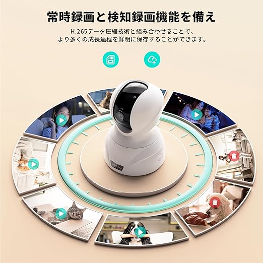 【臨場感溢れる800万画素&PTZ機能&8倍ズーム 】/3"カラーCMOSセンサーと高透過率6層レンズの採用により、業界最高の800万画素を実現しました。鮮明で繊細な映像で、人物やペットの表情がより生き生きとして実景に近く、超高画質の室内カメラで臨場感抜群です。相手の仕草や顔色までくっきりと見えるほど精細な映像を撮ることで、ペットや家族の体調不良に気づき、家族の健康状態にいち早く気を配ることができます。❷操作可能なPTZ機能(垂直5°、水平340°)や8倍デジタルズームもあり、まるで自分