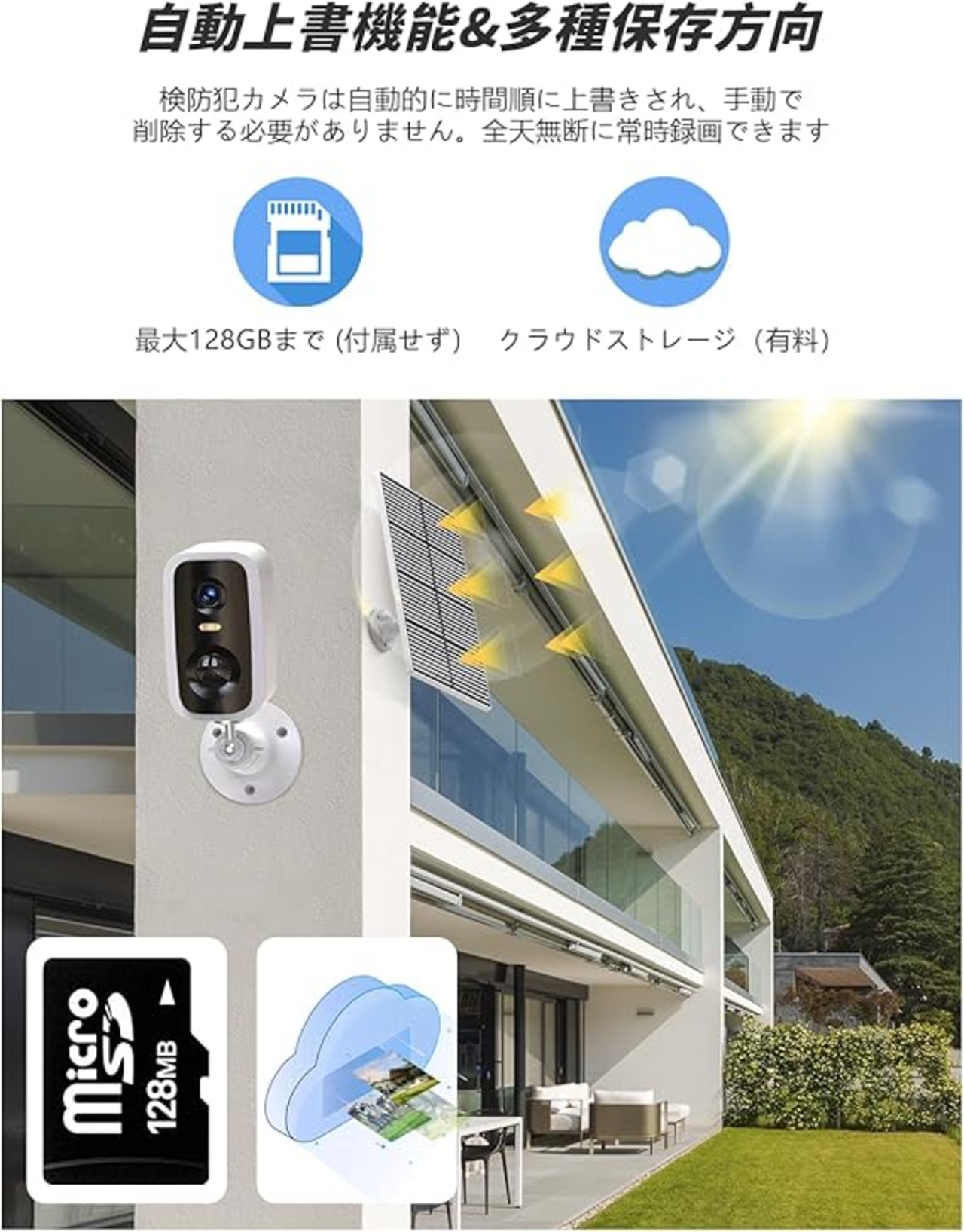 【太陽光発電ソーラー・5200mAHバッテリー】防犯カメラソーラー 屋外は低消費電力技術も搭載しているので一回フル充電する場合5ヶ月の超長持ち!5200mAhバッテリーとソーラーパネル搭載て、太陽光の吸収効率を向上して電池の使用寿命も延長しております。電源アダプターやコンセント等に接続することが面倒を省く、365日年中無休で稼働可能!付属の電源ケーブルを使用しても充電できます。