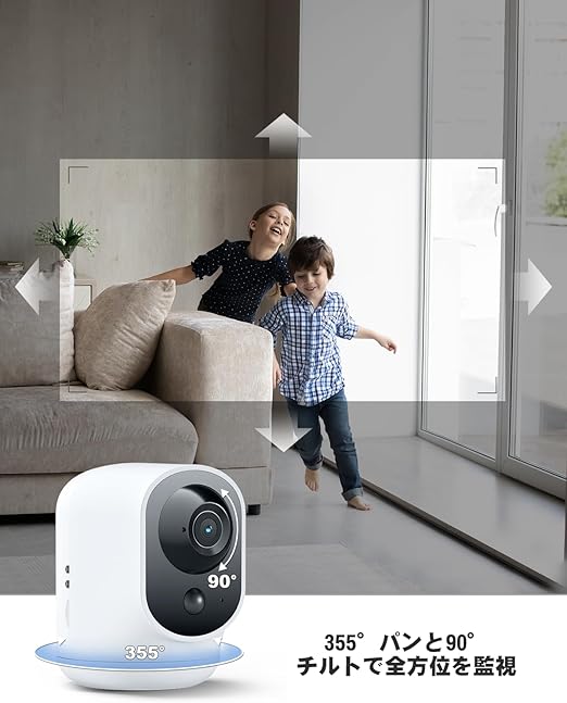 長持ちバッテリーとパン&チルト:充電式 5200mAhバッテリーを搭載したこの屋内セキュリティカメラは、長期的なパフォーマンスを提供します。フル充電で、最大 5000 回の動きを検知でき、継続的な監視を保証します。この屋内カメラは、水平方向に355°、垂直方向に 90° の回転範囲があり、広範囲をカバーし、部屋の隅々まで簡単に監視することができます。