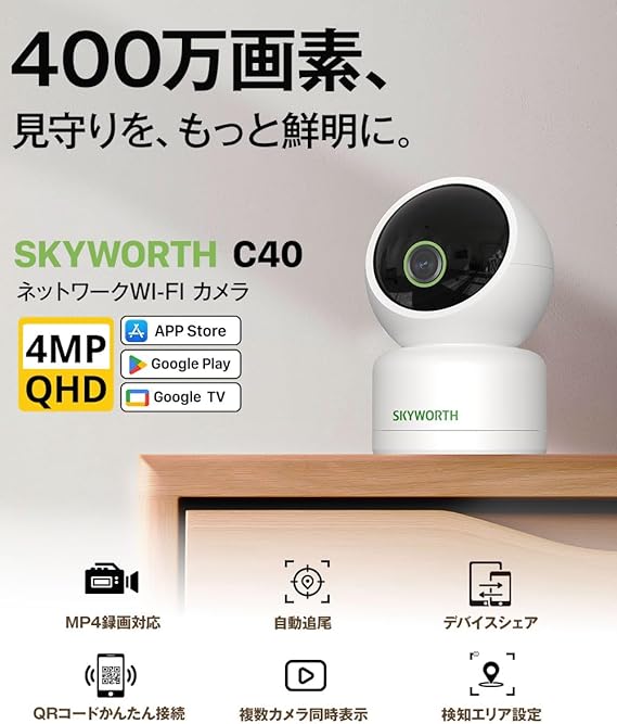 【400万画素・GoogleTV対応・プライバシー機能】 Skyworth ペットカメラ iphone対応 見守りカメラ 防犯カメラ 動体検知 自動追尾 360°PTZ首振り 監視カメラ スマホ通知 警報通知 赤外線暗視 双方向会話 24h常時録画 屋内Wi-Fiカメラ 接続台数無制限 犬/猫/お年寄り 室内カメラ 接続簡単 a