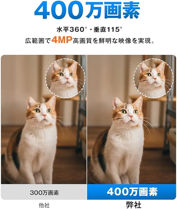 【400万画素の超高画質・5m赤外線暗視対応】 080pを超える400万画素(2688×440P)&F.6大口径レンズ+940nm赤外線LEDで、細部までくっきり鮮明に映像を表示。QHDクラスの高精細映像は逆光でも明るく見やすく、赤外線暗視により真っ暗な部屋でも夜間のペットの様子をしっかり確認可能。夜間でも安心して使える見守りカメラとして、ペットやご家族の様子を常に把握できます。
