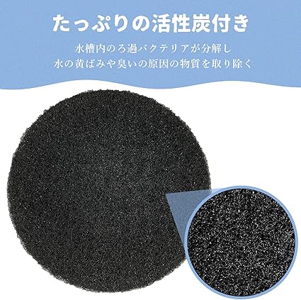 【水を綺麗に】本品が荒い目活性炭フィルターパッドで、純正品と100%同じではないので、ご注意ください。水槽内のろ過バクテリアが分解しきれない物質を吸着し、水の黄ばみや臭いの原因の物質を取り除く!