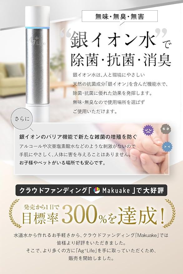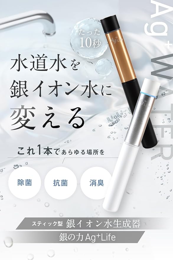 【たった10秒で水道水を除菌水に】Ag+Life(エージーライフ)は、水道水から除菌水(銀イオン水)を生成する画期的な製品です。本製品を水に浸して10秒待つだけで、銀イオン水ができあがります。