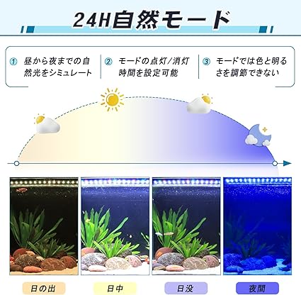 【24/7自然モード】hygger水槽ライトは、日の出・日中・日没・夜間の24時間自動調光できます。オレンジ・フルスペクトル・青の光循環で、自然光を模擬し、自然で鮮やかな光環境を提供します。2時間を単位で点灯/消灯時間を設定でき、最小2時間から最大24時間まで