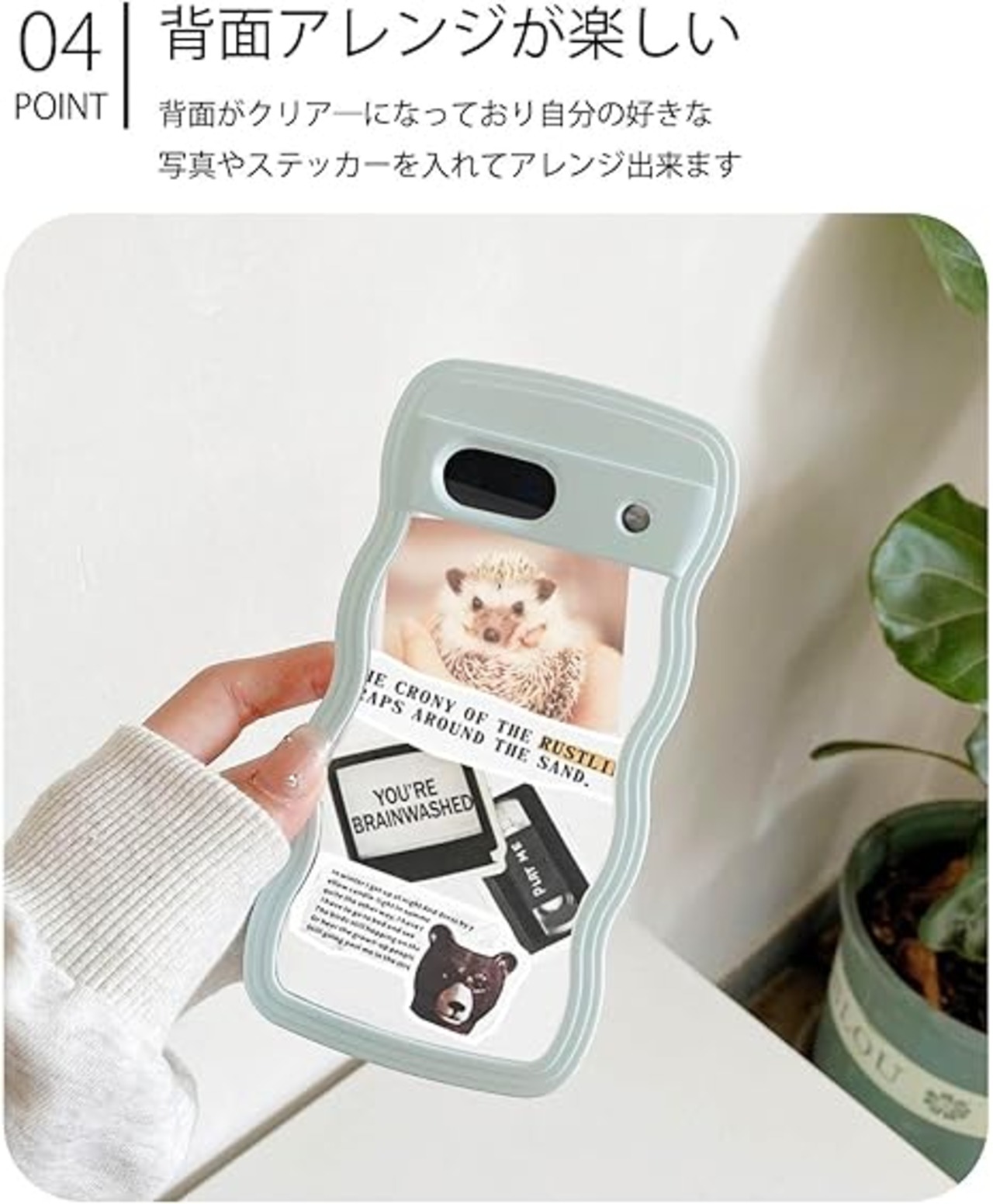 Point01.背面アレンジが楽しいケース 背面はクリアだからアレンジもしっかり楽しめます。 大切な思い出や推しを、あなた好みに詰め込んでトレンドのうねうねフレームと一緒に楽しめるスマホケースです。