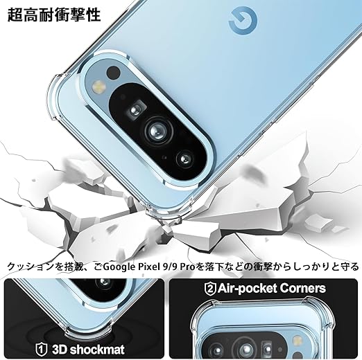 【衝撃吸収】 ゴムやシリコンのように柔らかいTPU素材使用!!本体に完全フィットし、全体を包み込むデザイン。保護ケースの四隅にエアショックパッドを設置して、スマートフォンが落下などの衝撃を吸収し、大切な Pixel 9/9 Pro を守ります