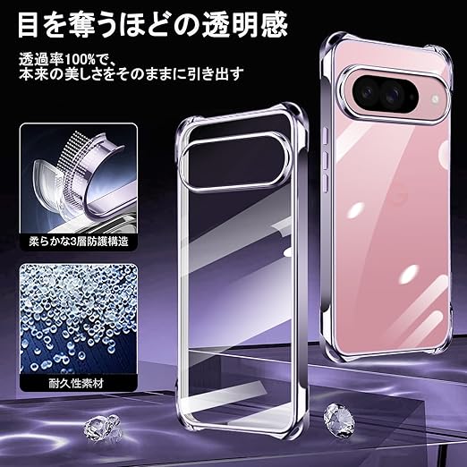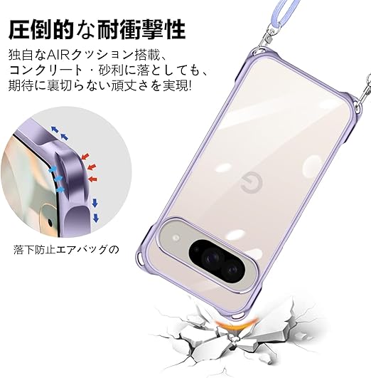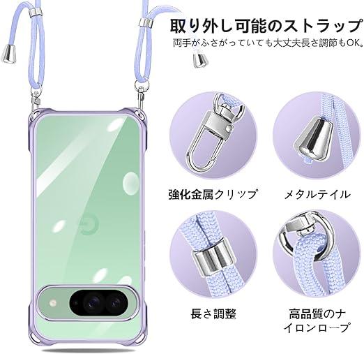 Google Pixel 9 / Pixel 9 Pro 用 ケース クリア ショルダー pixel9 / 9pro 用 スマホケース ピクセル 9 カバー 肩掛け 斜めかけ 縄掛けケース 透明 薄型 軽量 TPU 紐付き 斜めがけ 織りストラップ付き ネックストラップ ショルダー ケース 縦/横 2WAY 長さ調整可能 取り外し可能 落下防止 紛失防止 ワイヤレス充電対応 (パープル) a
