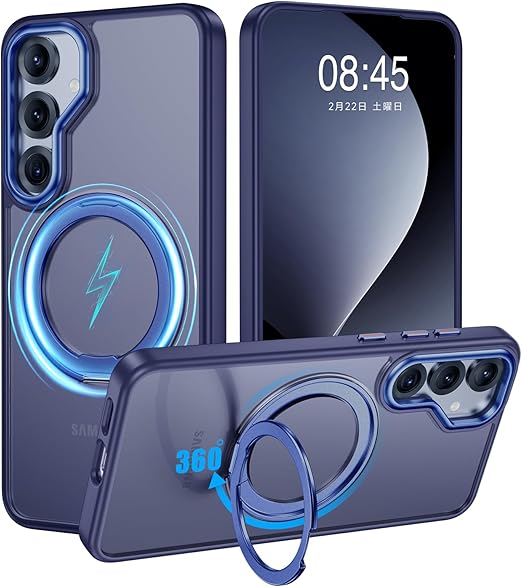 【米軍MIL規格・Magsafe対応】Galaxy S25 用 ケース MagSafe対応 リング 360°回転スタンド機能 縦横両対応 半透明 黄ばみ防止 ワイヤレス充電 レンズ保護 耐衝撃 携帯カバー ギャラクシー S25 カバー マグネット搭載 車載ホルダー マグセーフ対応 おしゃれ (ブルー) a