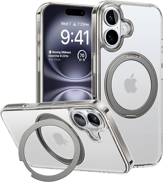【多機能360度回転スタンド・O型リング創始者】TORRAS iPhone16 用 ケース縦横両対応 ハルバッハマグネット搭載 MagSafe対応 米軍MIL規格耐衝撃 リング 指紋防止 黄変防止 マット マグセーフ対応 レンズ保護 両眼 いphone16 用 ケース 6.1インチ「Ostand R」チタングレー(クリアグレー) a